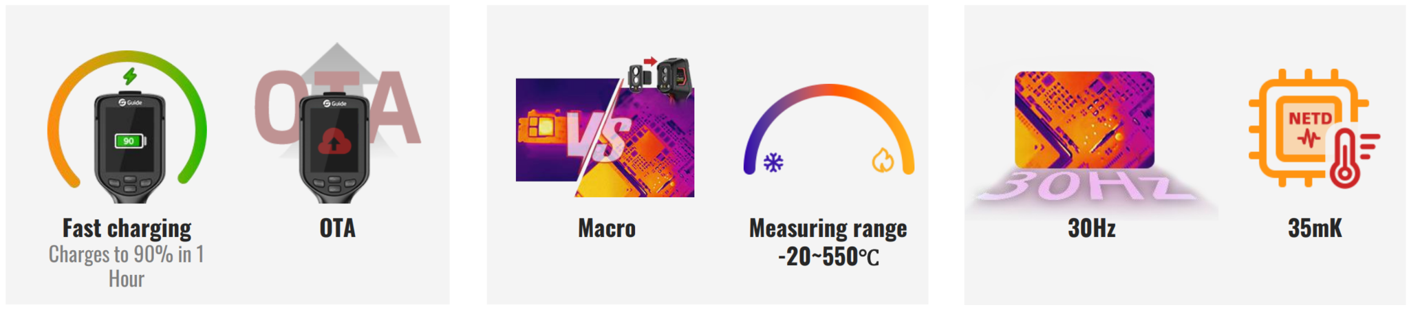 • Guide Sensmart E3 thermal imaging camera with an IR resolution of 256 x 192 and a 30mK sensitivity