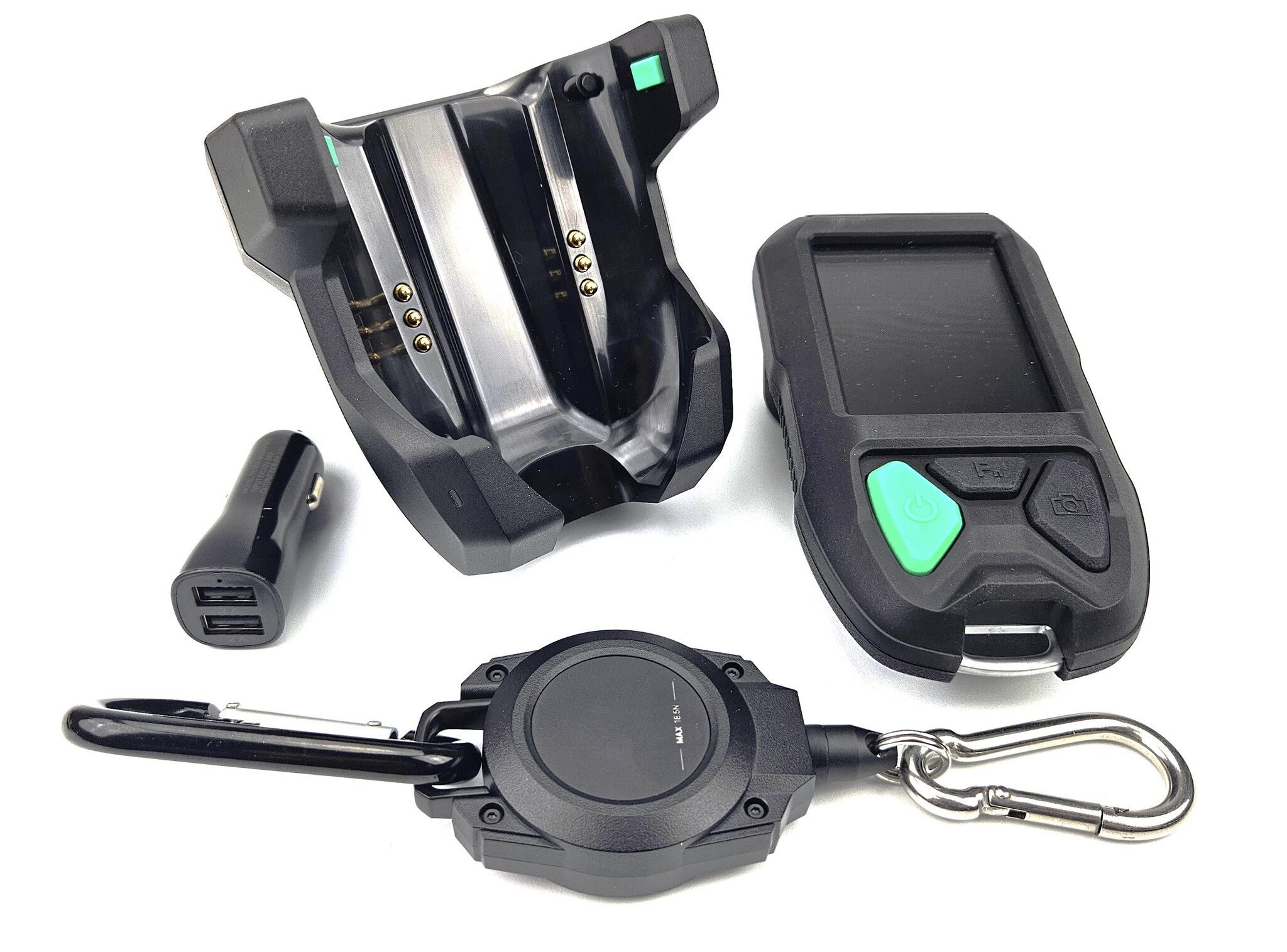 Wordt kompleet geleverd met laadstation, uittrekbare lenyard, carcharger, etc.